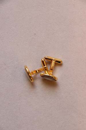 Goldtone cuff links with oval mother of pearl detail. Width: 1.5 cm. These are vintage accessories from Christian Dior, curated by Tarin Thomas x Studio Dorothy.