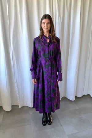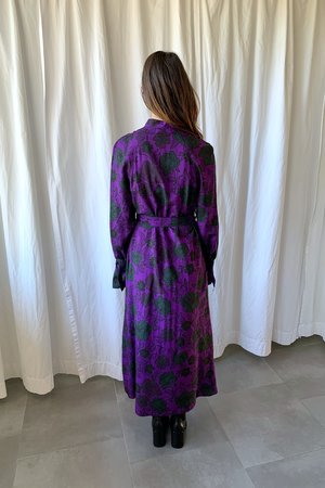 Mid-length trench coat with long sleeves pockets and belt in plum color print. - 55% Silk, 45% Rayon - Made in Portugal - Model is 5'8" and wearing size 34