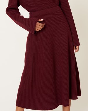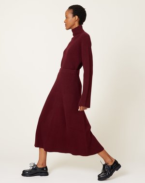 Christian Wijnants Kasar round knit skirt in bordeaux virgin wool. Whole garment rib knit skirt with elasticized waistband. Fitted through hips with subtly flared hem. Fit: True to size Material: Virgin wool Origin: Japan Care: Dry clean Model: Dora (5'8", 22" waist, 34" hip, 32A) wears a size Small Why we Covet: Fluid prints and vibrant artisanal knitwear Shown here with: Christian Wijnants Kanoni Turtleneck in Bordeux, Paraboot Michael Shoe in Gloss Noir