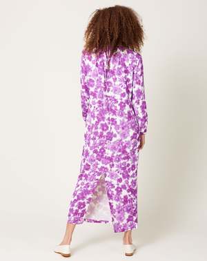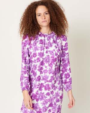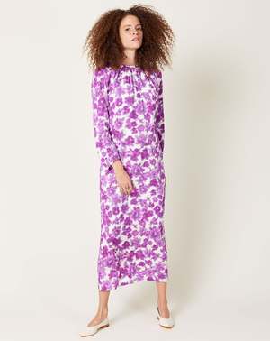 Christian Wijnants Devon Dress in Magenta Arenariain print. Mid length straight dress with gathered round neckline, piped bracelet length sleeves and tie detail in the back in fluid printed rayon blend. In-house hand designed watercolor floral print. Fit: True to size Material: Rayon, spandex Origin: Portugal Care: Dry clean Model: Alexis (5'9", 24" waist, 35" hip, 34C) wears a size 34 Why we Covet: Fluid prints and vibrant artisanal knitwear Shown here with: Martiniano Party Flat in Marble