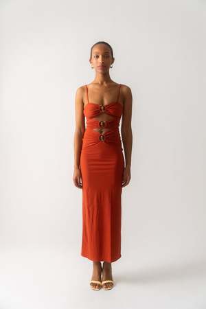 This Crystal Orbit Column Dress by Christopher Esber is crafted from ruched stretch-jersey with shimmering pierced cut-outs at the bust and midriff. The design is finished with the brand's signature brass orbit and crystal detailing, and features adjustable straps. - 72% Polyamide, 28% Elastane - Matte finish - Stretch blend - Midi length - Signature brass orbit and crystal detailing - Adjustable straps - True to size - Model wearing size 6 UK Colour: Orange.