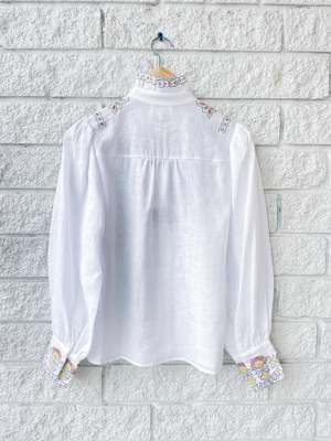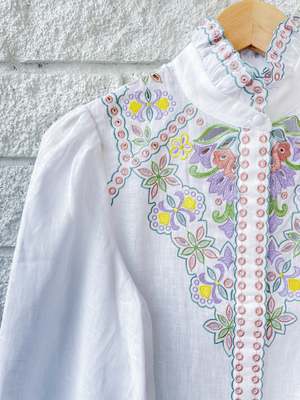 - Christy Lynn Ciara Top in White Combo - High neck - Embroidered ruffle neckline - Long blouson sleeve - Multi colored embroidered v shaped yoke
