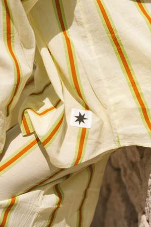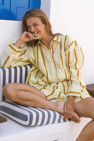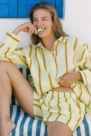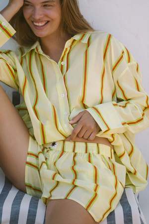 The Sandy Stripe Boxer Shorts from Ciao Ciao Vacation are a breezy staple for slow, sun-soaked days. Cut from lightweight, 100% recycled cotton, these shorts feature a relaxed fit and an easy elastic waist. Soft, sunwashed citrus stripes give them pure holiday energy. Why youll love them: - Airy, 100% recycled lightweight cotton - Relaxed, throw-on fit - Sunwashed citrus stripe - Pairs with the Sandy Stripe Bungalow Shirt for the full set Measurements based off size medium: - Half waist un-stretched: 34 cm - Half waist stretched: 54 cm - Waist to hem: 35 cm - Grade rule: 2.5 cm difference between sizes in waist, 1 cm difference in length.