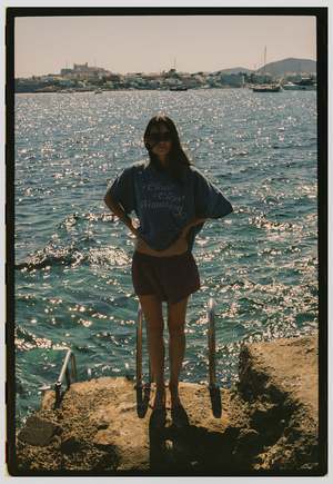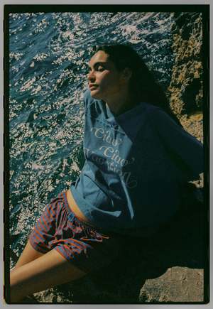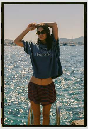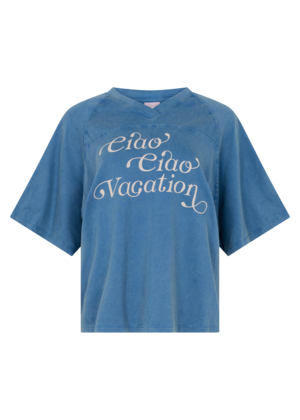 The Vacay Crop Tee by Ciao Ciao Vacation features a cropped, relaxed fit in an ocean blue colorway with signature "Ciao Ciao Vacation" script. Designed with a classic crew neck and short sleeves, this tee is crafted from 100% cotton for comfort. Model Angela is 175 cm and wears a size small. Measurements based on size medium: - Under arm to under arm: 72 cm - Shoulder high point to hem: 66 cm - Sleeve length from neck: 39.5 cm Grade rule: 2.5 cm difference between sizes in bust, 1 cm difference in length. Made in Indonesia. Ships October 10.