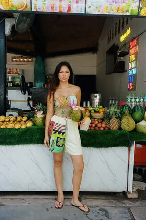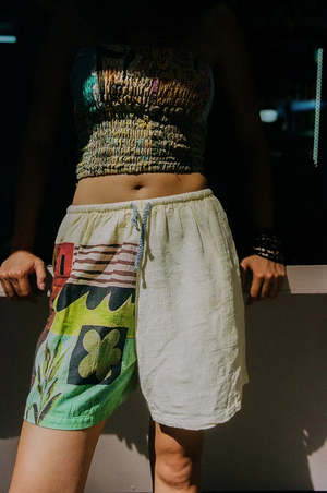 Spice Collage Riley block print shorts by Ciao Ciao. From tropical florals to earthy textures, the collage design brings a handcrafted, one-of-a-kind energy to a simple, wearable silhouette. Cut from lightweight cotton with a relaxed fit, the shorts sit comfortably on the waist with a drawstring tie that nods to vintage beachwear. Adjustable drawstring waist. Measurements from a size Medium: - Half waist (un-stretched): 31.5 cm - Half waist (stretched): 40 cm - Waist to hem: 40 cm - Grade rule: 2.5 cm difference between sizes in waist, 1 cm difference in length. Style code: CCV25_078.