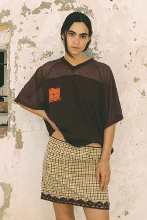 Ciao Ciao brown plum mesh raglan crop tee with CCV patch logo2. Contrasting mesh panel and relaxed sleeve create an effortless balance. Model is 175cm and wears a size small. Made in China. Style number: CCV25_037