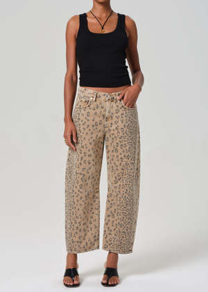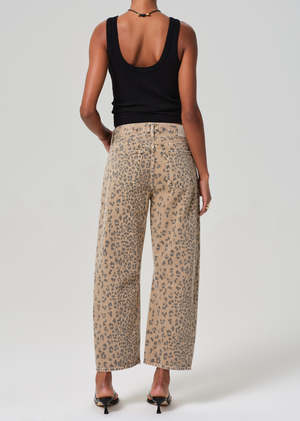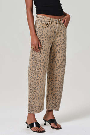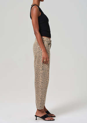 Citizens of Humanity Miro jean in natural cheetah print. Slightly relaxed top block and tapered take on the barrel leg silhouette. Medium indigo with fading, in a non stretch rigid cotton with vintage hand feel. Zip fly. This fit is true to size. Rise 11.25", inseam: 27", leg opening: 17.75". Model is 5'10" and wearing a size 27. 100% Cotton. Made in USA. 2149B-1248PR