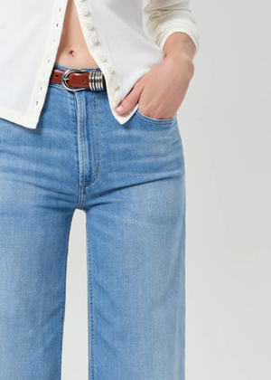 The Lyra is a vintage-inspired wide leg that sits high on the waist with a relaxed top block and full-length inseam. Crafted from soft stretch denim with a lightweight feel, this style features a clean dark indigo wash with soft fadingeasy to dress up or down with everything from sleek flats to heeled boots. This fit is true to size. Looks like: Light to medium indigo denim pant Feels like: Soft, stretch denim with a lightweight feel Closure: Zip fly Rise: 11 1/2" Inseam: 32" Leg opening: 24" Model is 5'10" and wearing a size 27. Fabric: 81% Cotton, 11% Lyocell, 6% Polyester, 2% Elastane Care instructions: Machine wash cold inside out with like colors. Do not bleach. Tumble dry low.
