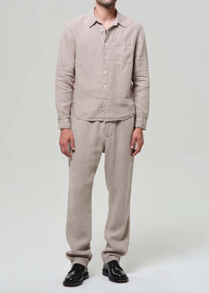 The Single Pocket Workshirt by Citizens of Humanity is a workwear-inspired button-up crafted from heavy linen for a structured yet breathable feel. Designed with a single chest pocket and a clean, utilitarian silhouette, it blends durability with refined texturea timeless staple that transitions effortlessly from workdays to weekends. Composition: 100% Linen Color: Wheat Fit: Body length: 28 1/4", chest: 44 1/2", sleeve length: 26". Model is 6'1" and wears size Medium. Type: Men's shirts Partner season: SS26 Colour ID: WHET Designer ID: M9034-1777
