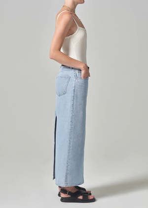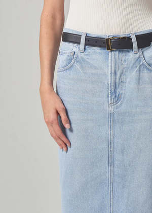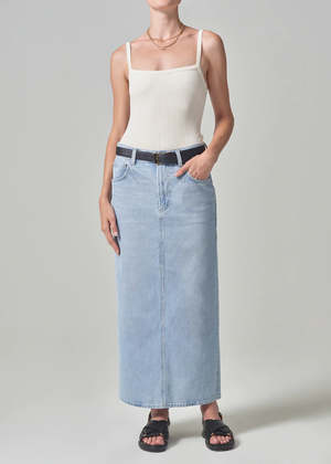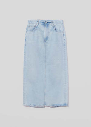 description: The Verona Skirt features classic five pocket detailing with a straight fit hitting right above the ankle. Style back to a slinky heel or a high boot. Looks Like: Light, clean indigo with a finished hem fabric: 100% Cotton Feels Like: Rigid cotton that will soften with each wear while keeping its vintage appeal Closure: Button Fly Machine wash cold Made in USA with imported materials measurements: This fit is true to size. Model is 5'10" and wearing a size 27. Length: 37 1 / 2" Hip: 39" Sweep: 38 1 / 2"