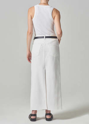 description: Reworked from classic 5-pocket denim construction. The Circle skirt is designed with a full-length inseam, raw hem and back slit detail. Pair yours with a classic tee shirt and blazer for an unexpected office look. Looks Like: Cream eggshell with a finished hem Feels Like: Rigid yet soft cotton with a soft authentic finish fabric: 65% Lyocell, 35% Cotton Machine wash cold Made in USA with imported materials measurements: Length: 36" Hip: 39 1/2" Model is 5'10" and wearing a size 27