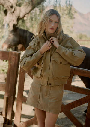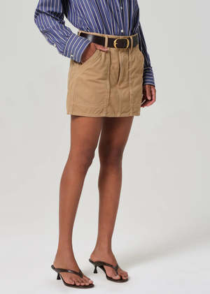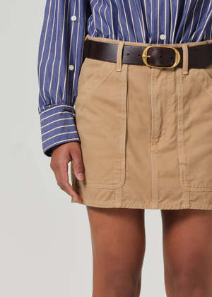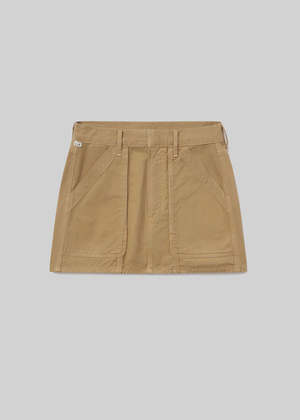 Utility mini crafted from luxe twill with patch pockets. Looks Like: Medium khaki utility skirt with a clean hem and long front pockets Feels Like: Heavyweight rigid, non-stretch twill made with regenerative cotton Fabric: 100% Regenerative Cotton Machine wash cold Made in USA with imported materials Measurements: This fits true to size. Closure: Zipper fly Length: 14 1/2" Hip: 40" Sweep: 41 1/2" Model is 5'10" and is wearing a size 27.