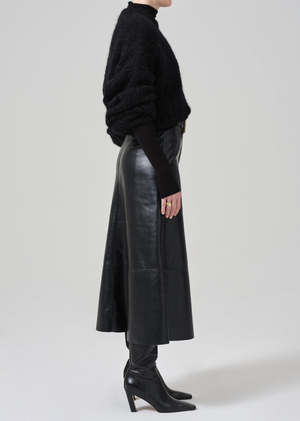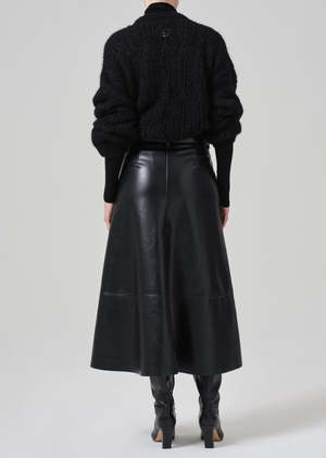 A modern classic, the Cassia is a sleek A-line skirt crafted from buttery recycled leather with a touch of stretch for effortless wear. The true black hue and clean silhouette offer timeless versatility with a refined edge. Style it with soft knits, structured shirting, or pair it back to the matching leather top for a full-set statement.