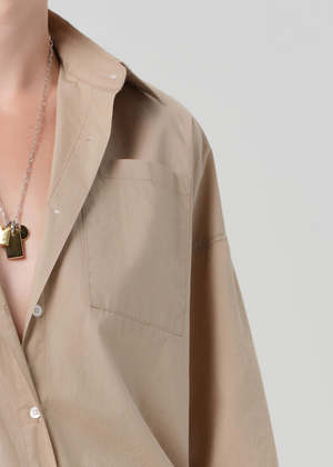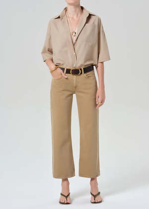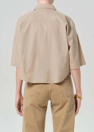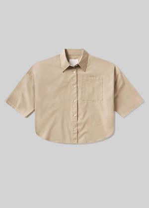 A modern update to the classic button-downclean, flattering, and thoughtfully tailoredthis shirt is an easy way to elevate everyday outfits. Designed with a cropped silhouette and short sleeves, it features carefully placed seam details for a more fitted, accentuating shape. Made from ultra-lightweight cotton that feels breathable and easy to wear. Structured yet soft. Fits true to size. Perfect with high-rise denim or a sleek skirt for an effortlessly polished look. An ideal piece when you want something simple that still feels elevated. Details Cropped short-sleeve button-up silhouette Light to medium beige shade Body length: 22" Chest: 45" Sleeve length: 9" Ultra-lightweight cotton fabrication Model is 5'10" and wearing a size Small Made from 100% cotton Machine wash cold inside out with like colors. Do not bleach. Tumble dry low.
