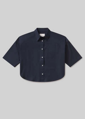 A fresh, modern take on the classic button-up. Lightweight, easy, and thoughtfully detailed, this is a standout warm-weather staple. Designed with a cropped silhouette and short sleeves, finished with a subtle cape-inspired back detail that adds softness and movement. Made from ultra-lightweight cotton poplin with an airy, breathable feel. Structured yet effortless. Fits true to size. Perfect with high-rise denim or tailored shorts for an easy, polished look. An ideal piece for warmer days when you still want to feel put together. Details Cropped short-sleeve button-up silhouette Dark navy shade Body length: 22" Chest: 45" Sleeve length: 9" Ultra-lightweight, breathable cotton poplin Model is 5'10" and wearing a size Small Made from 100% cotton Machine wash cold inside out with like colors. Do not bleach. Tumble dry low.
