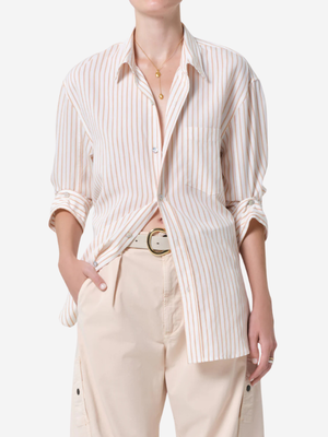 Citizens of Humanity's Kayla Shirt is a timeless button-up crafted from Italian lightweight shirting in a light orange and white stripe. Designed with a relaxed silhouette and long sleeves, it drapes effortlessly for a laid-back yet polished look. It pairs well with denim or tailoring and can be tucked, layered, or worn loose for everyday ease. Product Details Designer ID: 9103-1930_SHBST Color: Sherbert Composition: 88% Viscose 12% Polyamide