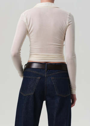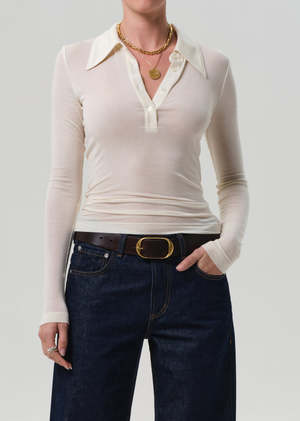 The Shaea Polo from Citizens of Humanity is a fresh take on the classic henley, featuring a pointed collar and streamlined long sleeves. Crafted from ultra-soft fine jersey with just the right amount of stretch, it offers breathable comfort and effortless polish. This fit is true to size. Looks Like: Off white long sleeve henley with pointed collar Feels Like: Ultra-soft, lightweight fine needle baby rib Body Length: 21 3/4" Sleeve Length: 24 3/4" Model is 5'10" and wearing a size Small Fabric Content: 94% Lyocell, 6% Spandex Care Instructions: Machine wash cold inside out with like colors. Do not bleach. Tumble dry low. Made in USA with imported materials.