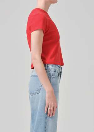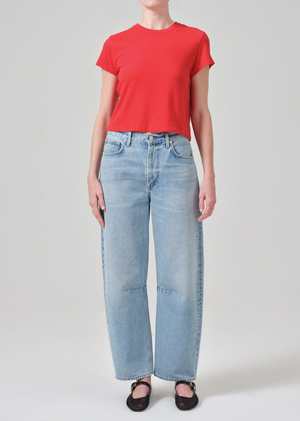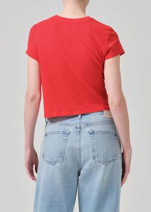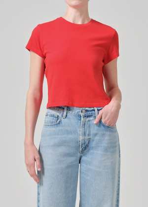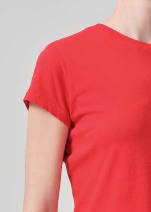 The Kyle T-Shirt by Citizens of Humanity is an effortless essential designed to be a staple in your wardrobe, season after season. Its slightly cropped boxy fit pairs perfectly with your favorite high-waisted jeans. Details: - Straight and cropped fit - Crew neckline - Color: Bright Red - Body length: 21 1/4" - Shoulder to shoulder: 14 3/4" - Sleeve length: 6 1/4" - True to size Model is 5'10" and wears a size S. Made from ultra-breathable 100% cotton that drapes beautifully on the body. Machine wash inside out with similar colors.
