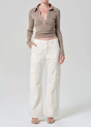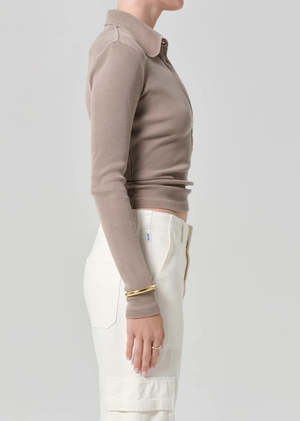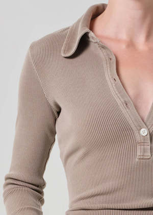 The Brea 60's Polo from Citizens of Humanity is a refined take on a vintage-inspired polo. Structured, flattering, and easy to style, its a piece that instantly elevates everyday outfits. Designed with a classic collared neckline and long sleeves for a clean, structured look. Made from ultra-soft ribbed cotton-blend fabric with a supportive, midweight feel that hugs comfortably without feeling tight. Fits true to size. Perfect tucked into high-rise denim for an effortless everyday look, or layered under a blazer for something more polished and refined. Details Long-sleeve ribbed polo silhouette Body length: 22" Chest: 29" Sleeve length: 24" Ultra-soft, supportive ribbed fabrication Model is 5'10" and wearing a size Small Fabric: 49% organic cotton, 49% Tencel lyocell, 2% spandex Machine wash cold inside out with like colors. Do not bleach. Tumble dry low.