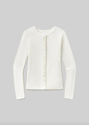 The Kari Cardigan is a refined essential crafted from an ultra-soft regenerative ribbed cotton blend that contours to the body with gentle structure and stretch. Designed with a clean crew neckline and a subtle button-front closure, it offers a smooth, second-skin feel while maintaining breathability and ease. Lightweight yet substantial, it transitions effortlessly from base layer to stand-alone piece modern, versatile, and timeless. Looks Like: Off white button-front ribbed cardigan Feels Like: Ultra soft and supportive ribbed cotton Fabric: 49% Organic Cotton, 49% Tencel Lyocell, 2% Spandex Care: Machine wash cold inside out with like colors. Do not bleach. Tumble dry low. Made in USA with imported materials. Measurements: This fit is true to size. Body Length: 28 1/2" Chest: 28 1/2" Sleeve Length: 24 1/2" Model is 5'10" and is wearing a size Small.