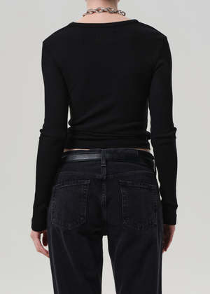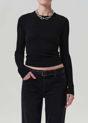 The Bina Crewneck from Citizens of Humanity is crafted from super-soft sweater rib with a hint of stretch. The Heather Brown huea rich, dark heathered toneadds warmth and texture to the slim, long sleeve silhouette. Ideal for layering or wearing solo with denim or soft tailoring. Looks Like: Dark heathered brown long sleeve crewneck Feels Like: Midweight intermingle chunky sweater rib that hugs the body - Body Length: 24 1/4" - Shoulder to Shoulder: 14" - Sleeve Length: 25 1/2" - Model is 5'10" and wearing a size Small - Fabric: 50% Polyester 32% Cotton 18% Rayon - Care Instructions: Machine wash cold inside out with like colors. Do not bleach. Tumble dry low.
