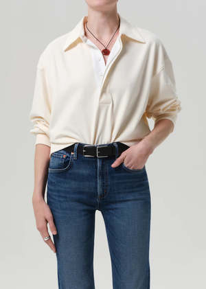 Why we love it A clean, elevated take on the classic rugby. Understated and easy, with just enough structure to feel polished. The fit & feel Cut with a relaxed, comfortable fit and finished with a crisp white collar for contrast. Made from luxe cotton with an ultra-soft hand feel that wears easily throughout the day. Fits true to size. How youll wear it An effortless piece to throw on with vintage denim for everyday wear, or style with tailored trousers for a more refined look. Details Classic rugby silhouette Off-white body with white collar detailing Body length: 22" Chest: 47" Sleeve length: 23" Soft, luxe cotton fabrication Model is 5'10" and wearing a size Small Made from 100% cotton Machine wash cold