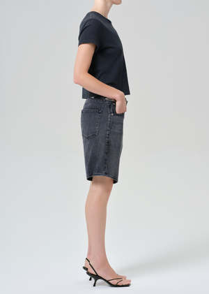 Citizens Ayla cut off short in washed out vintage black with a clean hem. This short has a versatile longer inseam that can just as easily be worn to the beach or styled with heels for an evening out. Rigid, organic cotton denim with a vintage hand. Button fly. Rise 12", inseam 9 1/2", leg opening 23 1/2". Model is 5'10" and wearing a size 27. 100% regenerative cotton. Made in Turkey with imported materials. Style code: 2225-3007.