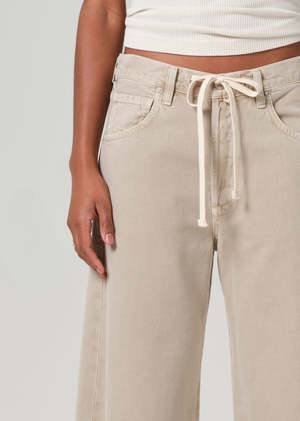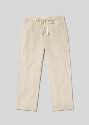 The Brynn Drawstring Trouser is the unofficial beach jean relaxed, effortless, and made for sun-soaked days. This trouser features a comfortable drawstring waist and an easy, laid-back fit. Pair it with tonal separates or a breezy tank for a look that moves seamlessly from the sand to the street. Looks like: Light khaki denim with drawstring detail. Feels like: Rigid, non-stretch cotton denim with a soft hand for all-day wearability. Fabric: 100% Regenerative Cotton Care: Machine wash cold inside out with like colours. Do not bleach. Tumble dry low. Made in USA with imported materials. Measurements: This fit is true to size. Closure: Button fly Rise: 12 1/2" Inseam: 30 1/2" Leg opening: 21 3/4" Model is 5'10" and is wearing a size 27.