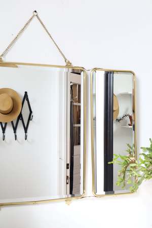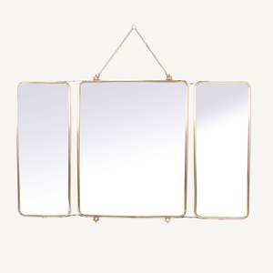 Folding brass mirrors with three panels offer elegance and versatility. Crafted from brass, they fold neatly for storage, providing a timeless addition to any space. Adjust the side panels for different angles or mirror viewpoints, enhancing functionality.