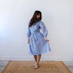 The Everyday Skirt is designed for ease and wearability, intended to complement existing wardrobes while standing confidently on its own. Each piece in this collectsion is thoughtfully crafted and free from harsh industrial treatments. Through hand-block printing and a careful cut and sew process, artisans and tailors in India bring these garments to life. Due to the nature of the creation process, there may be some variation from one product to the next. Wash each garment alone in cold water for the first 2-3 washes, as the color may bleed. Hang to dry and iron on low/medium heat. Made in India. Features mother of pearl buttons. Linen blend fabric. Model wears size small.