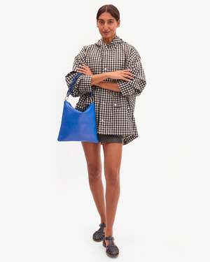Clare V. Foldover Clutch w/ Tabs in Electric Blue, featuring a red zipper. This style can be carried as a clutch or used as a bag when paired with an additional strap. Made of Italian nappa leather. Dimensions (in inches): 11 1/2 W x 11 1/2 H No interior or exterior pockets Lined in chambray Red zipper Loops to add an additional strap (strap not included) Made in L.A.