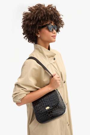 The Louis everyday crossbody bag is made from black croc-embossed leather with a lined interior. An exterior pocket allows for easy access to your small necessities. The front features a gold turnlock closure and the detachable, adjustable straps are made from 100% leather. Pair it with any Clare V. strap to customize your look. Details: - Leather - Dimensions: 8.5" W x 7.25" H x 3.5" D - Crossbody strap drop: 19.25" to 32.75" - Turnlock closure - Made in LA