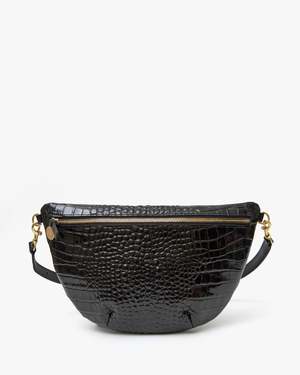 Meet your new go-to bag. The Clare V. Grande Fanny Congo Croco Bag is a versatile, hands-free essential that can be worn as a crossbody, bum bag, or shoulder bag. Crafted from croco-embossed Italian leather, it features a detachable, adjustable, and interchangeable 14-hole strap, combining functionality with style. With chambray lining, a black zipper, and a streamlined silhouette, this bag is perfect for everyday wear, keeping your essentials close without sacrificing sophistication. Details: - Material: Croco-embossed Italian leather - Dimensions: 12" W x 8" H - Strap: 19"39", adjustable and detachable - Lined in chambray - Black zipper closure - No interior or exterior pockets - Color: Black - Type: Bag Made in L.A.