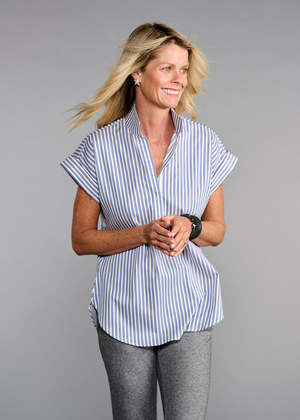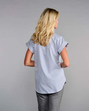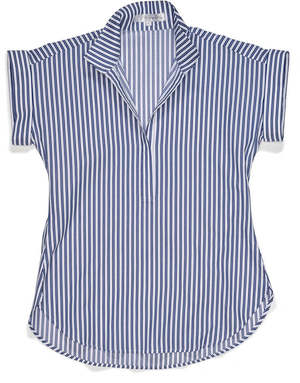 The Cap Sleeve League Shirt by Claridge and King features a practical navy awning stripe. Designed with a 2 -inch stand-up collar, refined V-neckline, and flattering cap sleeves, it can be layered or worn alone. Tuck it in for a polished look or leave it untucked to highlight the curved shirttail hem. Composition: 100% easy-care cotton.