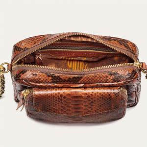 Trendy and timeless, python leather is one of Claris Virot's signature materials. - Python crossbody or shoulder bag - Main compartment with front pocket - Handcrafted chain - Iconic scarab jewel logo2 - Fully lined in cotton Measurements - Height: 15 cm - Length: 21 cm - Width: 5 cm - Chain: 115 cm Final Sale.