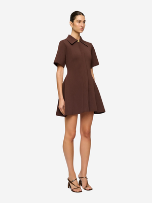 The Sorrel Knit Shirt Dress by CLEA is a fully fashioned mini crafted from compact crepe yarn with a dry handfeel. Designed with an extended shoulder, short sleeves, and a fitted waist, the silhouette falls into a soft A-line shape. A concealed placket with self-covered buttons creates a clean finish, while a bespoke gold button at the collar stand adds subtle distinction. Designer ID: 1535A Color: Arabica Composition: 54% Viscose, 46% Nylon.