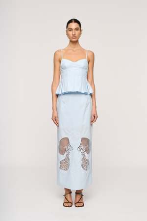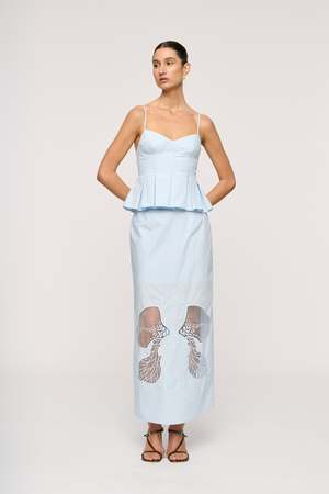 The Iris Pleat Top features a bustier-style silhouette with defined cup detailing and waist pleats that release into an exaggerated, sculptural profile. Crafted from a polished cotton fabrication, it includes fine adjustable shoulder straps, a centre-back invisible zip, and a finely executed double-turn hem. Fully lined for a clean internal finish. Designed to pair with the Leonie Skirt for a refined, coordinated set.