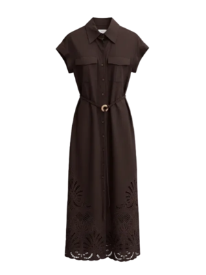 The Kya Dress by CLEA is a relaxed shirt dress elevated by intricate detailing and utility references. Cut to a midi length with an extended shoulder that creates a soft cap sleeve, it shapes the upper silhouette while maintaining ease through the body. The classic collar, stand, and button-through placket are accented with feature front buttons for a structured yet subtle look. Front patch pockets with flaps nod to utility wear, while a back yoke and pleat introduce movement and comfort. Heavily detailed bespoke embroidery is placed along the sides and hem, adding depth and texture to the clean silhouette. A rope belt with a raffia loop allows the waist to be cinched, offering the option to define or relax the profile. Product Details Designer ID: 1661A Color: Almadine Composition: 100% Cotton.