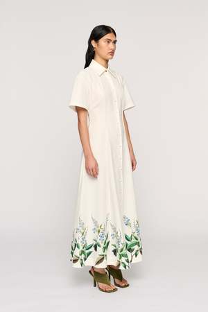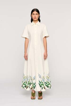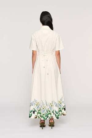 A refined interpretation of classic shirting, the Myra Shirt Dress is cut to a midi length with a full hem circumference that offers volume and ease through movement. Designed with a front placket, collar and stand, the silhouette is subtly shaped through considered panel lines and fine pintuck detailing. A rouleaux tie at the back allows for personalised fit adjustment, drawing in the waist or allowing the form to remain relaxed. Crafted from a high-quality linencotton blend, the fabrication is breathable and structured, ideal for summer wear. The Laurel Bloom botanical illustration is placement-printed with precision, framing the silhouette with quiet intricacy. Finished with fine self-covered buttons and full lining throughout. A composition of craftsmanship, print and proportion.
