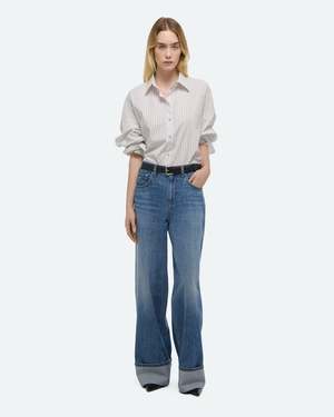 Classic blue denim, low-mid rise fit, wide leg, with exaggerated cuff. Fits true to size. Model is 5'11" and wears a size 26. Low rise, if between sizes, size down. - Oversized folded cuffs - Zip fly with button closure - Classic five-pocket style - Belt loops - Slightly dropped crotch - Leather logo2 patch on back - Straight leg - 31 inseam and 24 leg opening