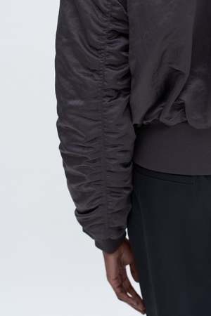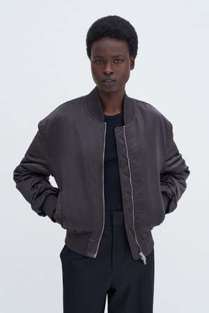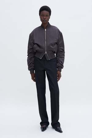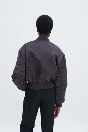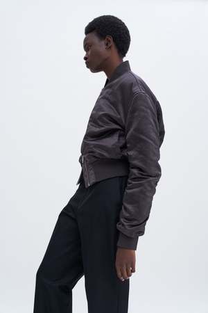 Nylon zip jacket with a slightly crinkled surface and lightweight padding. Designed with a classic bomber silhouette: an oversized fit, dropped shoulder, and cropped length. Throw it on over casual looks, or use it to balance out more formal pieces. - Dropped shoulder - Oversized - High hip length - Non-stretch - Two-way zip front closure - Ribbed edges - Light allover padding - Welt pockets - Fully lined Materials: - Lining: 100% Polyester (mechanically recycled) - Padding: 80% Polyester (chemically recycled), 20% Polyester - Shell: 100% Polyamide (chemically recycled)
