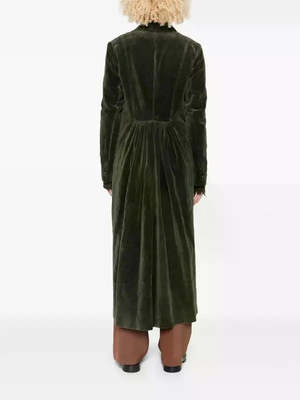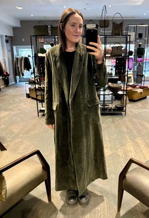 Double breasted long coat in a luxurious velvet with back pleating detail. Velvet is a cotton and linen blend. 55% cotton, 45% linen. Lining: 50% viscose, 50% cupro. Made in Italy.