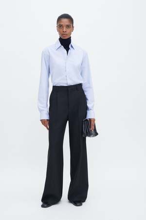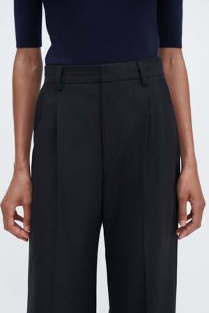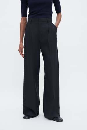 The Darcey Wool Trousers are designed with a high fitted waist, voluminous pleats, and a generous wide leg shape with an extra long length. Tailored from a black wool suiting blend. This piece is part of the Core Collection: permanent styles designed with the essential elements of a staple wardrobe in mind. - Model is 180 cm / 5'11'' and is wearing a size 36 / S - Extra long leg, wide leg - High waist, zip fly - Pressed creases - Slanted side pockets - Rear jet pockets - Size 36 inseam measures 81cm - 70% Wool, 30% Polyester