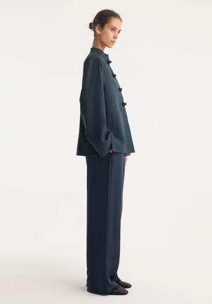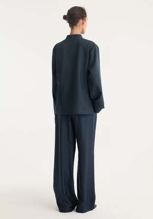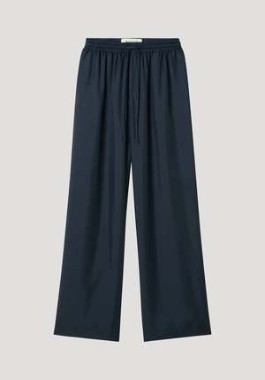 Staple wide leg trousers with an elastic waistband and drawstring, made in signature pure silk quality with a twill structure. A timeless classic for every wardrobe. - Elasticated waistband, drawstring, wide leg - 100% silk - Model is 179cm and is wearing a size EU 36 - (32/0, 34/2, 36/4, 38/6, 40/8) Also available in Black and Cream.