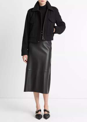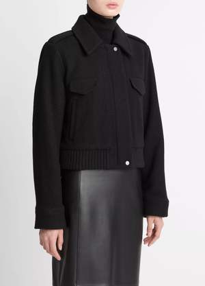 This shrunken cropped jacket is big on warmth. Crafted from an Italian boiled wool blend, it's exceptionally insulating, naturally water resistant, and durable against pilling. The fully lined interior and padded fill provide extra warmth. Features include a two-way zip-front closure, snaps at the top and bottom of the placket, flap chest pockets, rib-knit interior storm cuffs and bottom band, and a 22" length. - Fully lined and insulated - Hand wash cold, only non-chlorine bleach when needed. Line dry, cool iron if needed or dry clean. - 78% Wool, 22% Nylon. Lining: 100% Polyester. Fill: 100% Polyester. - Fabric imported from Italy.