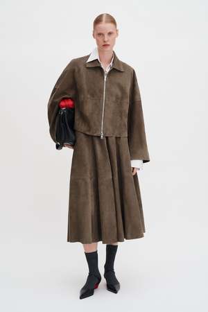 The Suede Coach Jacket is made in supple suede with an oversized fit. Designed with dropped shoulders, raw edge detailing, and hidden front pockets. Fits true to size, take your normal size. Model is 176 cm / 5'9" and is wearing a size 36 / S. Oversized High hip length Drop shoulder 100% Goat Leather Final Sale.