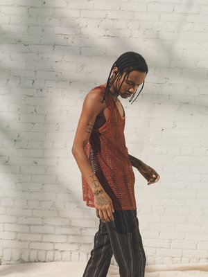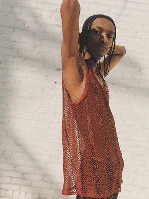 Tank vest with ribbed neck and armhole. Crafted from fine knitted Italian lace. 95% MIC 5% EA Model wears a Size S