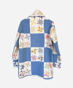 A mid-weight coat cut from a 1940's patchwork quilt. Small eight-point stars, in different calico and feedsack fabrics, float within a grid of large sky blue squares. Extra large collar, two front pockets, rose-colored corozo buttons, and trimmed sleeve detail. All wear is unique to sourced material. Dry Cleaning recommended. One of a kind Made in Los Angeles Size S / M: back width (underarm) - 21.5", back length (neck to hem) - 31", sleeve (shoulder seam to hem) - 24.5"