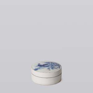 This small blue and white porcelain ink box features an auspicious pheasant pair design, inspired by 1920s motifs. Sourced from Jingdezhen, a town renowned for its porcelain craftsmanship. Dimensions: 5" D x 2 5/8" H.