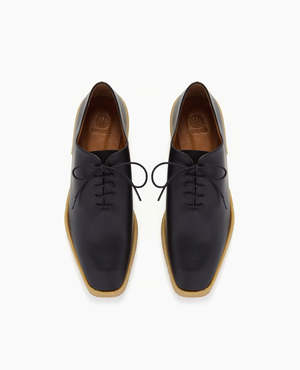 The Beech Oxford plays it cool with unexpected contrast. A polished black leather upper meets a chunky crepe-wrapped sole that feels both playful and purposeful. Inside, EVA inserts keep the unit lightweight, while a leather midsole and semi-flexible crepe outsole offer natural movement and grounded comfort. A downtown spin on a menswear staple, its sharp, substantial, and distinctly offbeat. Italian, certified sustainable leather Heel height: flat feel 20MM heel with a 5MM platform Natural crepe outsole, leather mid sole Made in Spain